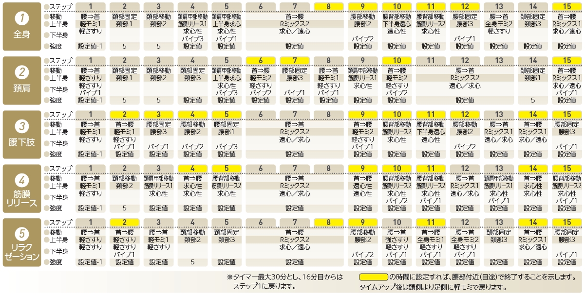 プログラムは部位ごとの「ほぐし」「ストレッチ」「押す」「揉む」「伸ばす」「振せん」等の機能を組合せ、